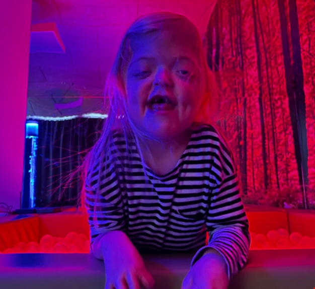 Ebba i bollhavet i Sinnenas rum på Ågrenska
