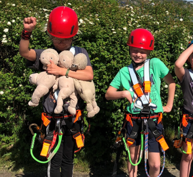Två barn och tre nallar redo för linbana under familjevistelsen