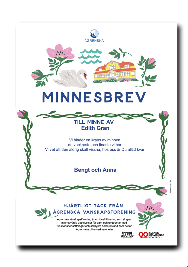 Minnesbrevet kommer att innehålla namnet på den person du vill hedra eller minnas, tillsammans med avsändarens namn och din personliga hälsning.